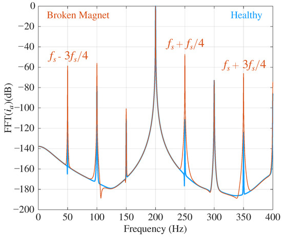 Comparison of the FFT spectra of the stator current in phase-a for healthy and broken PM.