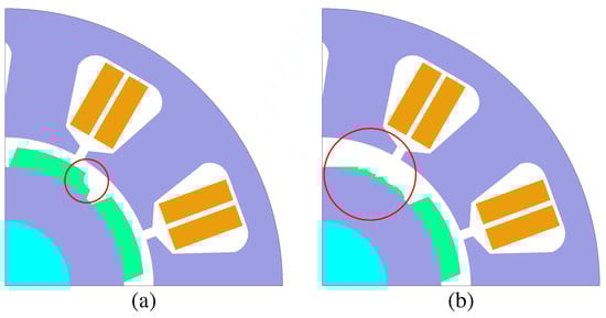 In this paper, a total of thirty-seven (37) simulated PMSMs are examined in nine (9) classes, one of which is in a healthy condition, and the others have various percentages and shapes of broken magnets. Despite the differences in the shape and size of the broken magnet, the same properties were applied to all of the motors in the simulation application. Figure 3a shows a broken magnet within the red circle that is cracked by approximately 3% in one magnet, which is labeled as “B1”, while Figure 3b demonstrates a broken magnet within the red circle that is cracked by approximately 83% in one magnet, which is labeled as “B7”. In this study, the healthy condition is labeled by “H”, and the motors with broken magnets are labeled from “B1” to “B8”.