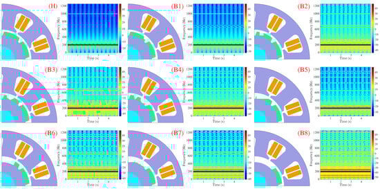 In this study, an STFT analysis of the stator phase current signal was used to detect symptoms of broken magnets in PMSMs. By analyzing the magnitude of specific harmonics, valuable insights could be gained into the condition of the rotor. Figure 4 presents the STFT spectrograms of the stator phase current and FEM model from all the labels. Healthy motors and broken motors with different percentages and shapes of broken magnets were used, both operating under the same conditions.