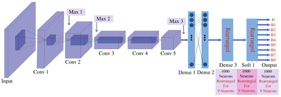 In this paper, nine (9) different classes of healthy and broken magnet PMSMs are investigated. We utilized this technique as an efficient and reliable solution when the available data for training a model from the broken magnet was limited. However, due to the challenges posed by the size and location of the broken magnet, diagnosing the broken one under operational conditions proved to be quite difficult. To capture both global and local information, a larger kernel size is preferred for the convolutional layer to obtain global information, while a smaller kernel size is used to extract local information. The neural network architecture used for broken magnet detection in the PMSM was based on the pre-trained AlexNet model. It consists of 11 layers with a total of 58 million adjustable parameters. Figure 5 depicts the architecture used for broken magnet detection and additional details are provided in Table 3. The new pre-trained AlexNet model consists of three max-pooling layers and five convolutional layers, each followed by a rectified linear unit (ReLU) activation function.