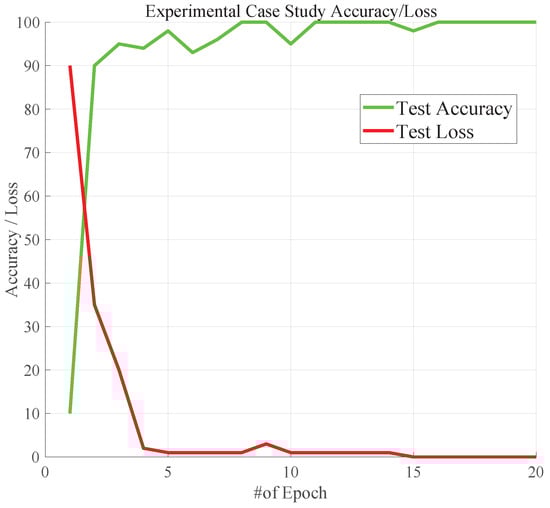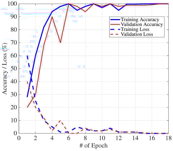 Accuracy and loss curve of the proposed pre-trained AlexNet CNN model for experimental case study under simulation-matching conditions (speed: 3000 rpm and load: 1.28 N·m).