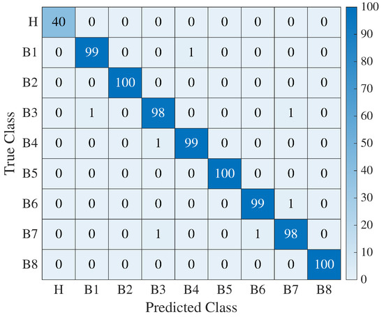Based on the simulation results, the proposed model achieved an accuracy of 99.94% on the training data with a 0.0004% training loss. This means that the pre-trained Alexnet CNN model with the rearrangement of fully connected layers was able to diagnose broken magnets with high accuracy and use raw data without any additional computational burden, which is a significant advantage of this method. Furthermore, to gain deeper insights into the model’s performance, a confusion matrix was employed to evaluate its classification abilities. The confusion matrix provided a detailed breakdown of the model’s predictions, enabling a comprehensive analysis of its true and false labels identified by the model. Based on the confusion matrix as shown in Figure 7, the proposed model exhibited exceptional performance in accurately classifying broken magnets, as evidenced by the high accuracy rate observed during training and validation. This reinforces the effectiveness of the pre-trained Alexnet CNN model with the rearrangement of fully connected layers for detecting broken magnets with remarkable precision and recall. The utilization of the confusion matrix helped us to assess the model’s ability to accurately detect broken magnets across different classes.