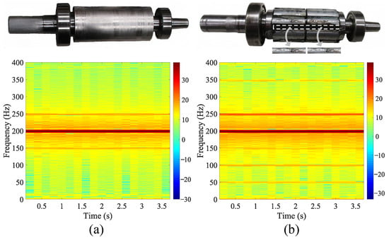 Experimental PMSM rotor with corresponding STFT spectrograms under simulated conditions: (a) healthy rotor; (b) rotor with a 4% broken magnet.