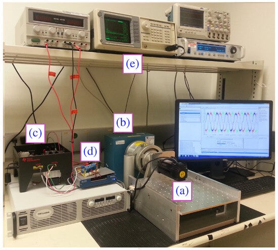 Experimental setup of the broken magnet PMSM drive: (a) PMSM; (b) dynamometer; (c) motor drive; (d) data acquisition card; (e) spectrum analyzer.
