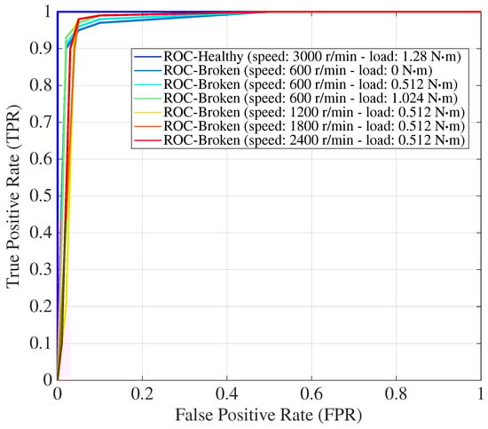 The experimental dataset, which includes the measured stator phase current of the motor under different loads and speeds, was used to train the proposed CNN model with transfer learning techniques. The ROC graph plots the model’s performance for each load and speed condition, providing a comprehensive evaluation of its diagnostic capabilities. A higher area under the ROC curve (AUC) indicates that the model can effectively differentiate between healthy and broken magnets, regardless of the load and speed variations.