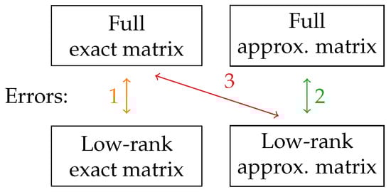 Schematics of the different kinds of errors of the low-rank compression that can be computed when introducing an approximate expression for the Green function. Errors 1 and 2 only measure the effect of the low-rank approximation, but error 3 is the one that is actually relevant to the study of the accuracy of a BEM solver with low-rank compression.