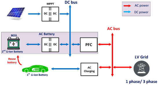 Recently, along with the significant growth in the number of electric vehicles (EVs), EV batteries have become an interest of application. The capacity of these batteries after being discarded from EVs is approximately 70–80% of the initial value [1,2], corresponding to the impedance of the end-of-life lithium-ion battery, which normally is obtained from the battery manufacturers [3]. After that, they can be reused as second-life batteries (SLBs). These SLBs can store and deliver power in stationary applications [4] or energy storage systems [5]. Especially, the concept of the home battery storage system [6,7,8] has been concerned with consisting of multiple resources: renewable energy, the low voltage (LV) grid, domestic loads, and EVs and the SLBs from them. Among the two main structures for the home battery, the AC-coupled one is selected in this research because of its ability to retrofit the installed home PV system, its isolated battery system, and its flexibility with extended modules. To that extent, the AC battery, integrating both the battery and the power converters, has been introduced by many well-known companies.