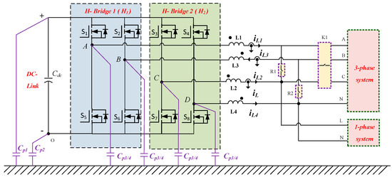 An EMI filter [22] is a traditional solution for the leakage current. In [23,24], the DC–bus midpoint is connected to the LCL filter capacitor midpoint in order to effectively reduce the DC–side leakage current. An integrated common-mode (CM) and different-mode filter with passive damping is proposed in [25] for grid-connected single-phase power converters for PV systems. Furthermore, an active CM filter is proposed in [26] for reducing the ground leakage current, but additional magnetic components and computational burden are required. Additionally, some modifications in structure by adding extra devices are applied in much of the research concerning full bridge converters. The H6 converter in [27] uses two additional switches, which would be turned off during the freewheeling period to disconnect the inverter from the DC source. The improvement of this structure can be mentioned in [28], with two additional diodes in the FB-DCBP inverter. Similarly, the AC side could also be bypassed with the HERIC inverter with two extra switching devices at the AC side [29].