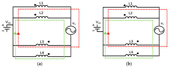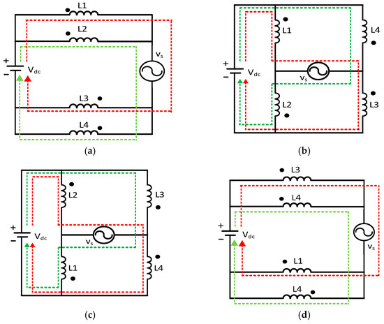 Because two bridges operate separately with the IB-PWM, based on the equivalent circuit in Figure 5a–c, all the split-inductor currents increase in the interval of DTs. Hence, the ripple of each inductor current is given as