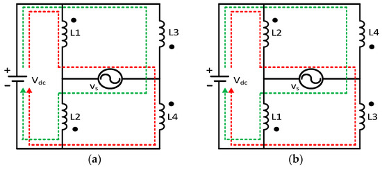 Assuming that the split-inductor currents are balanced: , the common-mode voltage can be calculated from Equations (1) and (2) as follows: