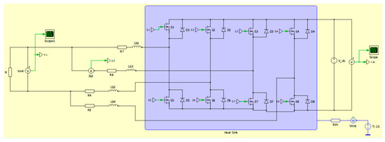 To determine the Mosfet power loss and thermal analysis, a thermal model of the IFB converter was built along with the thermal model using PLECS. The print screen of the simulated circuit is shown in Figure 12. PLECS allows researchers to provide the necessary parameters for the loss estimation of power semiconductors as the threshold voltage, thermal impedance, and drain-source on-state resistance. These are and can be used for the numerical estimation of losses using equations or implemented in the form of lookup tables for the turn-on loss, the turn-off loss, and conduction loss [16,20]. The simulation parameters are presented in Table 3. The power loss is compared among three PWM methods with 2 scenarios in the open-loop mode: variable switching frequency and variable power rate.