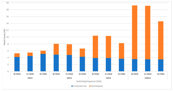 As shown in Figure 13, the conduction losses of all three PWM methods for the IFB converter are similar with multiple chosen switching frequencies. Whereas, the switching losses increases significantly when the switching frequency increases. Moreover, at the low frequency of 10 kHz, the switching loss in three PWM methods is almost the same; however, that of the ID-PWM is significantly smaller than those of other interleaved methods. In detail, the reductions of around 23%, 30% and 27% in the switching loss of the IU-PWM are achieved in comparison with other methods at the switching frequency of 30 kHz, 50 kHz and 100 kHz, respectively.