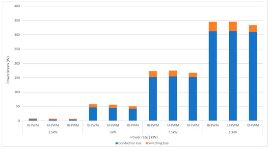 In this scenario, while the switching frequency is set up at 30 kHz, which is similar to the experimental scenario, the power rate varies among 1.5 kW, 5 kW, 7.5 kW, and 10 kW. As shown in Figure 14, while the conduction losses of all three PWM methods for the IFB converter are still similar at any specific power rate, there is a difference among the switching losses. In detail, the reductions of around 25%, 24.8%, 25%, and 28% in the switching loss of the IU-PWM are achieved in comparison with those of other methods at the power rate of 1.5 kW, 5 kW, 7.5 kW, and 10 kW, respectively.
