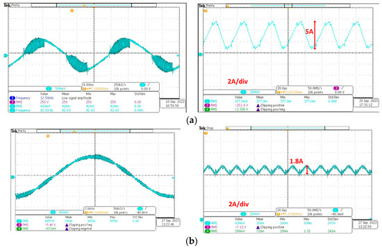 The current responses are shown in Figure 17, Figure 18 and Figure 19. Overall, the currents through the split inductor L1 and L2 are interleaved, which leads to the output current ripple being smaller than the inductor current ripple. In detail, the largest peak-to-peak current ripples of the split-inductor with the IB-PWM, IU-PWM, and ID-PWM are approximately 3 A, 3 A, and 5 A, respectively. These results show good agreement with the theoretical analysis in Section 2. In addition, the output current ripples with these three PWM methods are 2.5 A, 2.5 A and 1.8A, respectively, which proves the effectiveness of the interleaved technique for reducing the output current ripple. Moreover, the ID-PWM gives the smallest output current ripple as the aforementioned theory.
