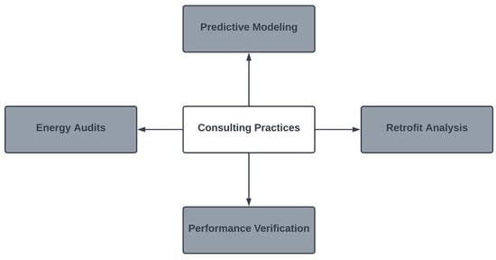The second critical aspect of our review explores how these simulation tools are integrated into consulting practices within the realm of building energy management. Consulting in this context refers to the professional services offered to clients seeking energy-efficient solutions for their buildings, whether they are new construction projects or existing structures requiring retrofitting. Consulting practices in building energy management encompass various activities, including energy audits, predictive modelling, retrofit analysis, and performance verification (Figure 1) [22]. These practices aim to provide clients with actionable insights, data-driven decision-making, and solutions for enhancing energy efficiency while ensuring occupant comfort. The integration of simulation tools into consulting practices presents both challenges and advantages. White-box models, such as EnergyPlus and TRNSYS, offer a detailed understanding of building energy systems but demand extensive inputs and calibration efforts. Their application is particularly suited for projects where a thorough comprehension of energy behaviour is critical, such as retrofitting projects and complex building systems optimization.