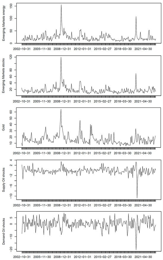The main objective of the developed exercise is to analyze the volatility spillover dynamics among supply and demand oil shocks, gold, and energy and stocks of emerging markets. In consequence, monthly prices for the MSCI emerging markets index, the MSCI emerging markets energy index, and gold were retrieved from Bloomberg. For oil supply and demand shocks, the decomposed oil supply and oil inventory demand shocks constructed by Baumeister and Hamilton [] were downloaded from the personal website of Professor Christiane Baumeister at “https://sites.google.com/site/cjsbaumeister/research (accessed on 14 August 2023)”. All the price series have been transformed to log returns as a way to circumvent the problem of non-stationarity or unit roots of the time series [] to posteriorly be used as inputs to estimate volatility, as described in the methodology section. The analyzed period comprises 246 observations ranging from October 2002 to March 2023. Table 1 shows the main features of the employed data.