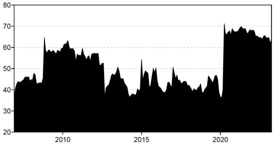 Numerous studies in the financial literature highlight the changing behavior of volatility spillovers over different intervals. In consequence, in Figure 1, the OCM is analyzed from a dynamic perspective to understand the changing patterns of volatility connectedness among the studied variables. This exercise was developed using a rolling window length of 54 observations and 3 months ahead forecast errors []. As can be observed, the OCM does not exhibit stable behavior. On the contrary, this measure is fluctuating continuously in a range between 30 and 50. The OCM’s highest peaks were reached during the subprime crisis and the COVID-19 pandemic, when this index showed values over 60 and 70, respectively. This confirms that volatility spillovers increase during turbulent periods, as previous studies suggest [,,]. However, it should be mentioned that Figure 2 shows a higher increase in volatility spillovers during the COVID-19 pandemic compared to the 2008 financial crisis, suggesting that the impact of the 2020 crisis is unprecedented []. Finally, it is evidenced that the high levels of connectedness reached during both financial crises were maintained during the following years.