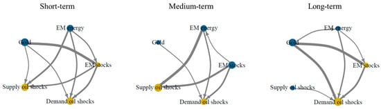 To obtain further insights into the volatility spillover dynamics among the employed variables, the Baruník and Krehlik [] approach is utilized to examine spillovers in the short, medium, and long terms. In this exercise, a rolling window length of 54 observations and 13 months ahead forecast errors [] were employed. Moreover, the intervals from 1 to 6 months, 6 to 12 months, and 12 months onwards were defined as short, medium, and long terms, respectively []. Table 4 (Panel A) presents the volatility spillovers among gold, emerging markets energy and stock indices, and supply and demand oil shocks in the short (Panel A), medium (Panel B), and long terms (Panel C). In addition, Figure 3 depicts these results through network representations.