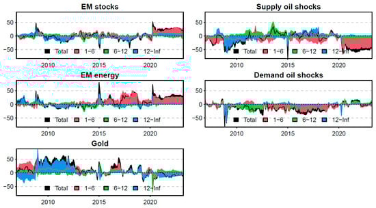 In consequence, net volatility spillovers for each asset and index were estimated in the short, medium, and long terms. As depicted in Figure 5, the emerging markets energy index presents similar patterns to the supply oil shocks measure. Both net volatility spillover series exhibited increases during the 2008 and 2020 financial crises and the 2015 oil price crash. This is not the case with the demand oil shocks variable, which acts as a net receiver of disturbances from the system for most of the analyzed period. This is reasonable considering that it has been suggested that unanticipated changes in the oil supply play a more relevant role than demand shocks in price oil fluctuations []. In this line, it could be expected that the emerging markets energy index is affected by drastic changes in oil prices, mainly driven by supply oil shocks. Moreover, it should be mentioned that medium- and long-term effects are predominant when supply oil disturbances are net transmitters of shocks to the system; meanwhile, short-term effects are prominent during these intervals for the energy index, except for the mentioned financial crisis and the 2015 oil price crash. The above suggests that the effects of energy markets induced by the oil supply unanticipated changes are enduring over time in emerging markets.