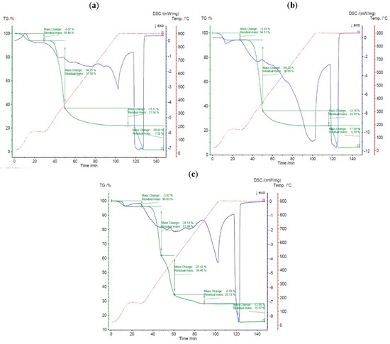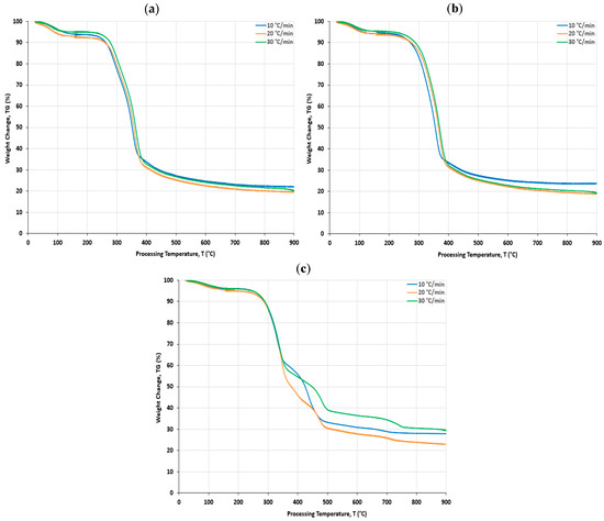 The experiments were conducted in an STA-449 F5 Jupiter® thermogravimetric analyzer (NETZSCH-Gerätebau GmbH, Selb City, Germany), with powder samples weighing approximately 20 mg, using Nitrogen (N2) as the atmosphere gas at a flow rate of 50 mL/min. The reaction temperature rose to 900 °C from the environmental temperature of about 25 °C.