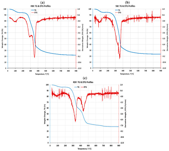 In addition, the data of the TG and derivative thermogravimetry (DTG) are plotted in the same graphs and shown in Figure 3a, b, and c for HW, SW, and RDF, respectively, where TG represents the mass change as a function of temperature.