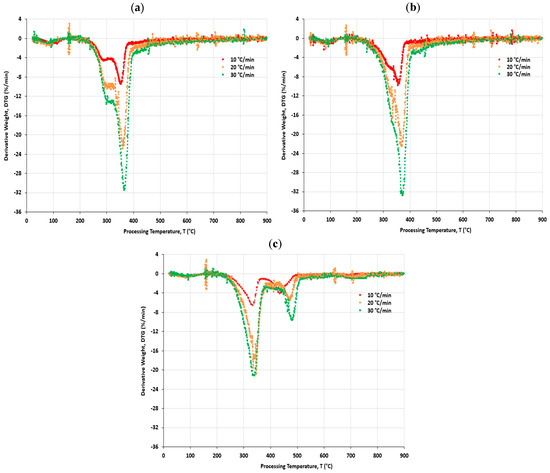 The TG observations from Figure 1 are confirmed by the DTG data of several peaks for the three biomass feedstocks (HW, SW, and RDF), as shown in Figure 3. The first peak on the DTG curve in the temperature range of 30–150 °C can be attributed to the elimination of the humidity for the biomass materials. The significant change in weight loss is associated with the temperature of the peaks from 200 °C to 500 °C, when the decomposition rate is high. The down peaks were endothermic reactions at temperatures of 350 °C, 370 °C, and 320 °C for the HW, SW, and RDF, respectively. Other significant down peaks at 325 °C and 430 °C showed endothermic reactions in the HW and RDF curves, as in Figure 3a and Figure 3c, respectively. The up peaks are exothermic reactions during the decomposition process and those observed in Figure 3a–c at temperatures of 310 °C, 320 °C, and 380 °C for the HW, SW, and RDF, respectively.