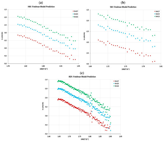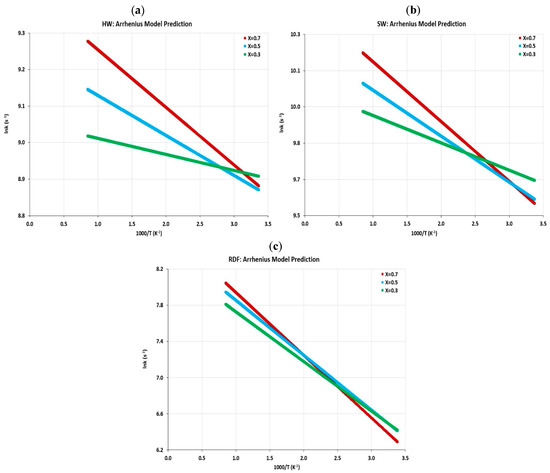 The reaction rate constant, k(T), describes the reaction velocity as a function of the absolute temperature, and it can be represented by the Arrhenius equation (Equation (3)). Therefore, in this study, the values of the rate constant were estimated for a conversion degree in the range of 0.3 ≤ X ≤ 0.7 using the Arrhenius relationship, as shown in Figure 6a, b, and c for the HW, SW, and RDF, respectively.