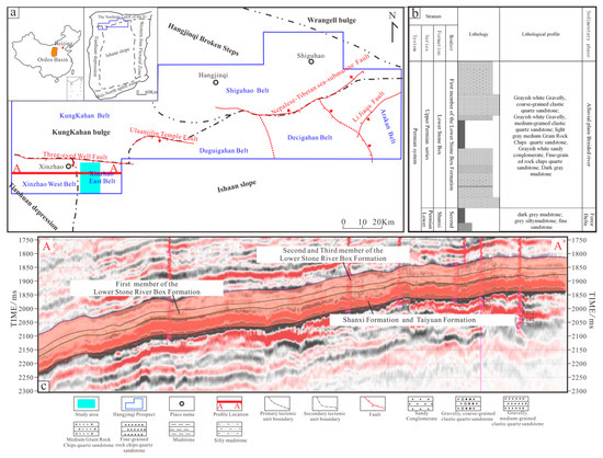 The Ordos Basin is the second largest basin on land in China. Geographically, it spans the five provinces of Shaanxi, Gansu, Ningxia, Mongolia, and Jin (Figure 1a,b). Tectonically, it is located in the southwestern part of the North China Plate. The basin is characterized by the development of several hydrocarbon-bearing formations, such as the Upper Paleozoic Benxi Formation, Taiyuan Formation, Shanxi Formation, Shangshibang Formation, and the Mesozoic Yan’an Formation and Yanchang Formation [29]. Several oil and gas fields have been discovered in and around the Ordos Basin, such as Surig, Shenmu, Dainiu Di, Dongsheng, Changqing, Ji Plateau, etc. The Hangjinqi Prospect area is located in the northern part of Ordos Basin, spanning three tectonic units: Ishaan Slope, Tianhuan Depression, and the Northern Uplift of the IU. The Xinzhao East belt D-well Zone is located in the southwestern part of the Hangjinqi Prospect area. It is located in the northern part of the Ishaan slope, south of the three-eyed well fault fracture (Figure 1a). In the studied section, the combination of birth, storage, and cover is lower birth and upper storage. The Lower Stone Box Formation is the reservoir. Hydrocarbon source rocks are developed in the lower Shanxi Formation and Taiyuan Formation [9] (Figure 1b,c). The study area has many favorable features for reservoir formation, such as extensive overlying hydrocarbon production in coal hydrocarbon source rocks, multi-layer stacked continuous development of sand bodies, and wide distribution of regional cover [30]. The first member of the Lower Stone Box Formation is the destination layer, with a burial depth of about 3000 m. During the Late Permian, the studied section was in a period of unification of tectonic patterns and depositional environments in the northern Ordos Basin [31]. The sedimentary phase of the studied section is controlled by the quartz-rich source zone of the Middle Proterozoic in the northwestern Yinshan Paleoland. The first member of the Lower Stone Box Formation is in a braided river depositional environment. This environment develops sedimentary microfacies such as heart beaches and channel fills in the depositional environment. The lithology in the studied section is greyish-white and gravelly, with coarse-grained quartz sandstone and conglomerate.
