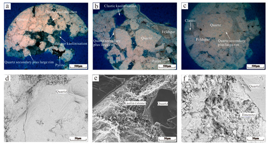 According to three rock sheets, six CT scan images of 25 mm diameter samples, three field emission scanning electron microscope images, and coring wells, the lithology of the studied section is dominated by gravelly coarse-grained clastic quartz sandstone and sandy conglomerate. The gravel content of is about 10%, dominated by quartz gravel, which is rounded-subrounded. The mineral grain fractions are mainly quartz, feldspar, and clastic, with 55~85% quartz, 5~8.5% feldspar, and 7.5~40% clastic (Figure 2). The fillings are mainly ilmenite and kaolin (stone) (Figure 3c,d), as well as some white mica, black mica, and chlorite [35], with kaolin (stone) formed mainly from feldspars and labile clasts. The rock matrix grains are predominantly sub-prismatic-sub-rounded, poorly sorted and rounded, with low structural and compositional maturity (Figure 3). The grain structure is predominantly gravel-bearing unequal grains (Figure 4). The support is mainly pellet support and heterogeneous base support. The particle contact relations are mainly linear and concave–convex contacts (Figure 4).