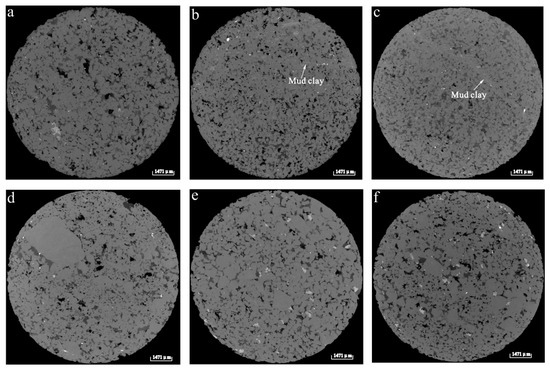CT scan image of 25 mm diameter samples. (a) Gravelly, coarse-grained clastic quartz sandstone, 3514.50 m; (b) gravelly, coarse-grained clastic quartz sandstone, 3515.41 m; (c) gravelly, coarse-grained clastic quartz sandstone, 3515.59 m; (d) sandy conglomerate, 3516.03 m; (e) sandy conglomerate, 3516.91 m; (f) sandy conglomerate, 3517.51 m.