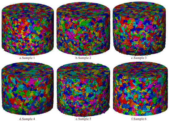 In order to reduce the image noise, the 3D scanned data volume of the core samples was subjected to two Gaussian filtering processes. The mineral components in the CT scan samples were identified and calibrated, which was based on the segmentation principle of the watershed algorithm in 3D image processing software [34], as well as field emission scanning electron microscope images, petrographic thin sections, and other data. Using an adaptive method, the quartz particle size was segmented to obtain a three-dimensional image of the particle segmentation. Based on the 3D image software, the particle diameter size was calculated and counted.