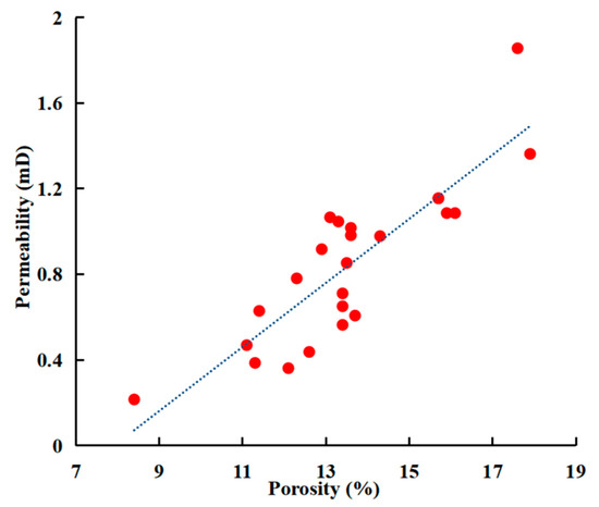 The porosity distribution of the first member of the Lower Stone Box Formation in the Hangjinqi Prospect area ranges from 4% to 16%, with an average value of about 9.8% [30]. The average porosity of the full-diameter core CT scan experiments of the studied section is 9.15%. The average porosity of the gravelly coarse-grained clastic quartz sandstones from CT scan experiments of cut samples within 25 mm diameter samples is 10.53% and the average permeability is 0.73 mD; the average porosity of the sandy conglomerates is 13.40% and the average permeability is 1 mD. Based on helium porosimetry and gas permeability meter test results, the porosity distribution of the studied section ranged from 8.4% to 17.9%, with an average porosity of 13.60%. The permeability distribution is 0.22~1.88 mD, with an average permeability of 0.85 mD. The overall porosity and permeability of the study section showed a significant positive correlation with a good correlation (Figure 7). The reservoir’s physical characteristics indicate that the studied section belongs to the dominant reservoir class of dense sandstone.