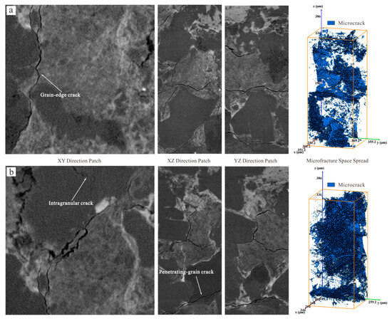 CT scan image and spatial spread of microcracks. (a) Gravelly, coarse-grained clastic quartz sandstone, 3513.96 m; (b) sandy conglomerate, 3517.02 m.