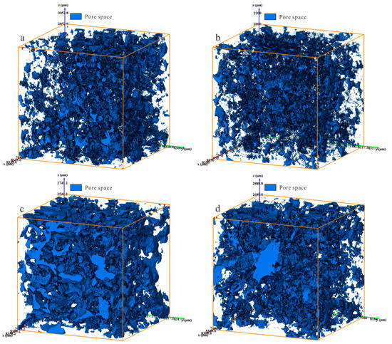 Spatial distribution of microscopic pores. (a) Gravelly, coarse-grained clastic quartz sandstone, 3515.41 m; (b) gravelly, coarse-grained clastic quartz sandstone, 3515.59 m; (c) sandy conglomerate, 3516.91 m; (d) sandy conglomerate, 3517.51 m.