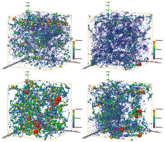 Based on the experimental sample pore 3D scanning data body, the “Maximum Ball Algorithm” was used to extract the pore and throat [33]. Based on this, the hole–throat ball-and-stick model was developed. The maxball algorithm has the following elements: using a set of pore voxels as the center of the sphere, using skeletal (matrix) voxels as boundaries, all pore voxels in the interior of the maximal sphere are taken to be all voxels inside the boundary. The largest ball constructed is the pore. Structuring the constructed maximal sphere clusters, depending on the size and relative position of the largest ball, orifices and throats are created. The passage between the balls is known as the throat.