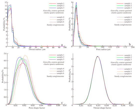 The sample throat radius of the studied section is mainly between ~1 and ~25 μm, with peaks mostly smaller than 7 μm (Figure 11a). The pore radius is mainly distributed in the range of 3~42 μm, with a peak of about 14 μm (Figure 11b). The pore shape factors are mainly distributed in (0, 0.0481] (Figure 11c), indicating that the pore cross-section shape is mainly dominated by triangles [38]. The throat shape factors are the same for each sample, and the curves approximate the normal distribution (Figure 11d); it is shown that the shape characteristics of the throat shape defined with the maximal ball algorithm are essentially the same [39]. The maximum number of coordination numbers ranges from ~45 and ~97 and the average number of coordination numbers ranges from ~2 and ~4 (Table 2). The above data show that the throats of the studied section are dominated by fine throats, the pores are dominated by small pores, and the connectivity of the pores and throats is good (Table 2). Various types of pore–throat structural parameters of the sandy conglomerates are better than those of the gravelly coarse clastic quartz sandstone (Figure 11). Meanwhile, the permeability of the sandy conglomerates gas layer in the studied section is good, indicating that the pore–throat structural parameter is an important factor influencing the physical properties of the reservoir of the gas layer.