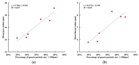 The relationship between quartz particle size and pore throat radius. (a) Relationship between quartz particle size and pore radius; (b) relationship between quartz particle size and throat radius.