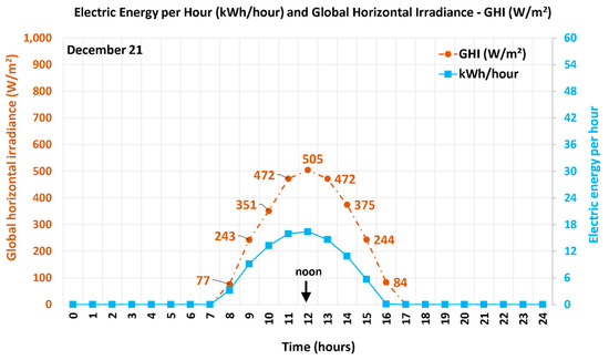 Figure 3 and Figure 4 combine the hourly profiles of the solar radiation and the estimated electric generation for 21 June and 21 December, respectively. The solar radiation for 21 June from PVGIS corresponds specifically to the year 2009, rather than an average over several years. Inspecting radiation data for the same day in the years 2011 to 2020 reveals that the irregular drop in the radiation at three data points (corresponding to 10 a.m., 1 p.m., and 3 p.m.) in the raw data reflects a transient incident rather than a consistent behavior for that particular day. This was remedied by reconstructing the solar radiation at exceptionally low values by linear interpolation using the two adjacent radiation values. This partial reconstruction gives a smoother radiation profile.