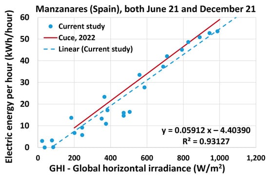 Scatter plot for the dependence of the electricity generation on the solar radiation for the modeled Manzanares (Spain) SUTPP and comparison with another study.