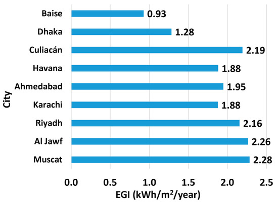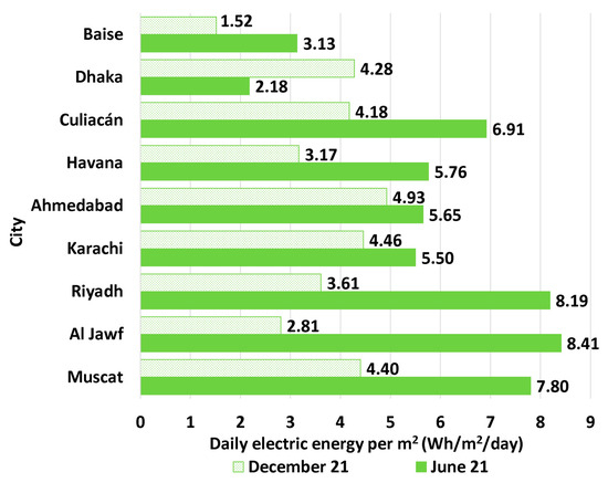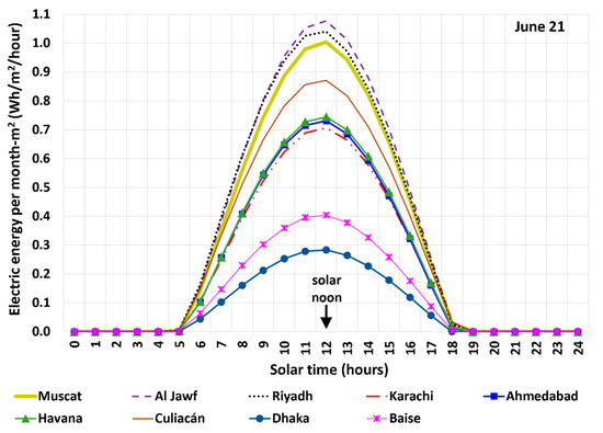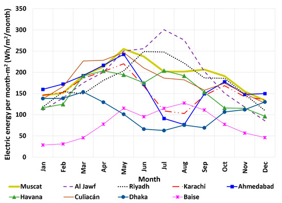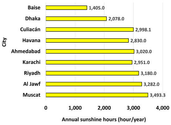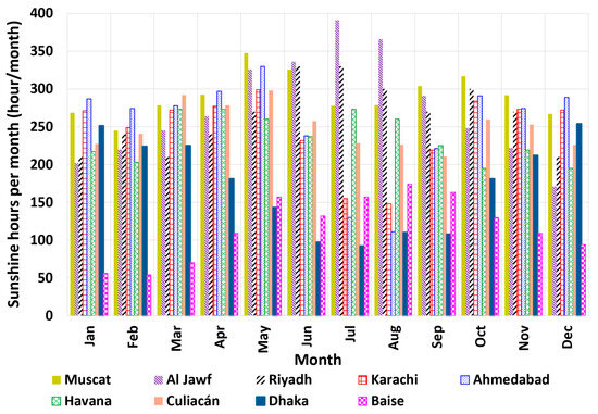 The rationale behind selecting the nine specific locations (cities) for SUTPP modeling comes from the desire to have Muscat be one of them. Muscat is the capital of Oman, where this study was prepared, and thus it has a special local importance. In order to make the study of better value and with a much wider international scope, eight other cities were added into the analysis. Thus, a total of nine cities are included here. Four out of these nine sites are the capitals of their countries. When selecting the cities, it was intended to have them at nearly the same latitude (near 24° north). This eliminates the influence of the latitude on the performance of the modeled SUTPP due to its relation with the angular coordinate of the sun and its path [75]. Variations in the performance can still arise from differences in the climate, such as having a season of heavy rains like the so-called “summer wet monsoon” [76] or a season of heavy cloudiness.