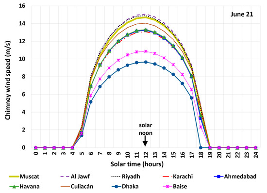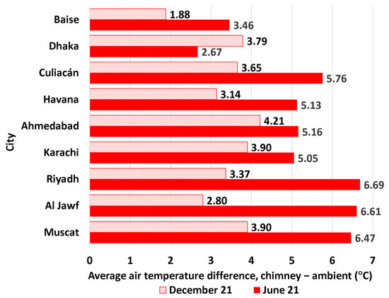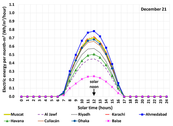 Multiple performance characteristics of an SUTPP that resembles the Manzanares (Spain) pilot plant are demonstrated, with the scenario that this SUTPP is operating in nine different cities/towns (in nine different countries in the northern hemisphere) with a similar latitude near 24°, putting them within the global sunbelt [38,39], where solar radiation is generally high. Including locations from around the world in the analysis helps in expanding the scope of the current study by not focusing on one country with a limited range of interested readers. Contrasting the expected performance of the small-scale SUTPP in different geographic locations (in three continents) shows a large disparity due to strong variations in the climatic conditions throughout the year. The performance characteristics examined and presented here include year-based results, month-based results (for each of the 12 calendar months), and hourly profiles for two particular days that are representative of the extreme summer conditions (21 June) and the extreme winter conditions (21 December) in the northern hemisphere.