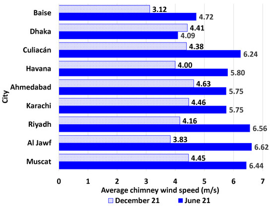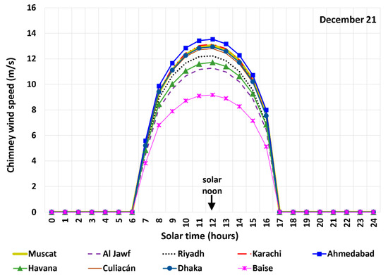 The air velocity at the bottom of the chimney, which is the upstream condition for the wind turbine inside the chimney, is