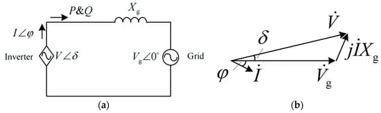 24]. The internal voltage loop and current loop are responsible for tracking the voltage reference generated by the power loop and can improve the stability of the system. Assuming that the feeder impedance is purely inductive, the inverter output voltage can be controlled by establishing the droop characteristics of active power to phase and reactive power to voltage amplitude. Therefore, the grid-forming grid-connected inverter can be regarded as a controlled voltage source, and the system can be simplified into an equivalent circuit as shown in