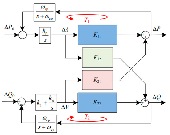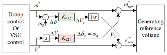 Figure 4. Assuming that the active power command value remains unchanged while the reactive power command value steps at a certain time, the reactive power controller will increase the voltage amplitude to track the new command value. In the absence of decoupling control, it can be seen from (1) that the increase in voltage amplitude will also lead to an increase in active power. Due to the unchanged command value for active power, the active power controller is compelled to passively decrease the phase difference through the feedback mechanism to maintain a constant output.
