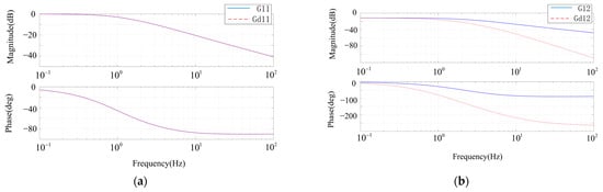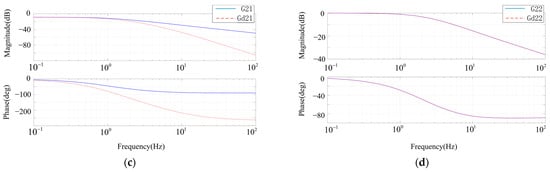 Figure 8. It can be seen from the bode diagram that the addition of the decoupling network has basically no effect on the diagonal elements, but the magnitude of the off-diagonal elements decreases significantly after the addition of the decoupling network, which proves that the decoupling scheme can significantly suppress the coupling of active power and reactive power control loops.