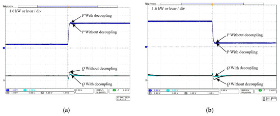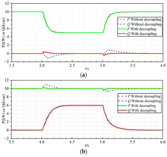 Figure 11b, the active power command value steps from 5 kW to 0.8 kW. In the whole process, the reactive power remains unchanged at 0.8 kvar. It can be seen that without decoupling, the reactive power fluctuates significantly with the change in the active power command value. After adding the amplitude feedforward decoupling control, the fluctuation of the reactive power is significantly reduced, and the recovery speed is greatly improved, which proves the effectiveness of the reactive power decoupling control. In addition, the active power waveform before and after introducing the decoupling control is basically overlapping, which proves that the amplitude feedforward decoupling control has no effect on the active power.