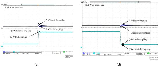 Figure 11d, the reactive power command value steps from 5 kvar to 0.8 kvar. The active power command value remained unchanged at 0.8 kW throughout the process. It can be seen that the active power fluctuates significantly with the change in the reactive power command value when there is no decoupling. After the frequency feedforward decoupling control is added, the fluctuation of the active power is significantly reduced, and the recovery speed is greatly improved, which proves the effectiveness of the active power decoupling control. In addition, the reactive power waveform before and after introducing the decoupling control is basically overlapping, which proves that the frequency feedforward decoupling control has no effect on the reactive power.