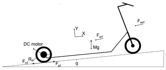 When an electric motor is installed on the electric scooter (ES), as illustrated in Figure 2, the propulsion torque is represented using the following equation: