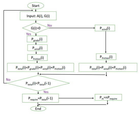 Based on the total power consumed (Ptotal), the power of an electric motor (Pm) to assist the rider while pedaling was chosen. The flowchart in Figure 3 outlines the calculation procedure for calculating the required power (Prq) of the electric scooter. The frontal area (A(i)) and slope grade (G(i)) are examples of input parameters, with index ‘i’ standing for each individual input parameter.