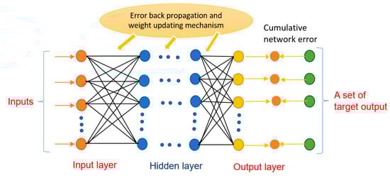 Machine learning approaches including artificial neural networks (ANN) are effectively utilized for tasks such as pattern recognition, classification, regression, and prediction. Inspired by the design and operation of biological neural networks in the brain, a neural network has several layers, including output, hidden, and input layers. Each layer contains a specific number of neurons. The neurons perform two main functions: the summation function, which calculates weighted inputs, and the activation function, which processes this sum to generate the neuron’s output. Information flows unidirectionally through the network, moving from the input layer to the output layer. Every layer receives signals from the neurons of the layer above and sends its own output to the layer above. Backpropagation (BP) neural networks propagate the cumulative error between the final network output and the actual value, which is frequently determined using experimental data [23]. This backward propagation enables the adjustment of weight values throughout the entire network mechanism. Figure 4 presents a visual representation of this process.